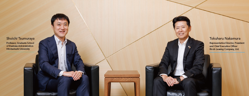 Ricoh Leasing is often praised for its serious and honest business development. The reality is that, though the Company has distinctive businesses born from this seriousness, society is largely unaware of them. What is needed to further enhance the corporate value of Ricoh Leasing,which has been supporting small and medium-sized enterprises since its founding and is engaged in businesses that contribute to solving social issues? This is the question posed in this dialogue with Shoichi Tsumuraya,Professor at the Graduate School of Business Administration at Hitotsubashi University.
