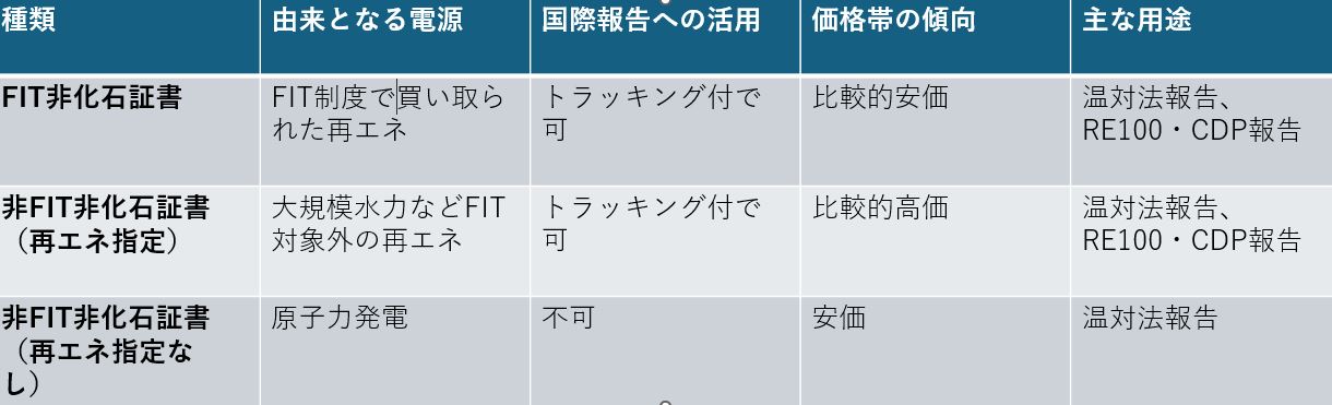 非化石証書は、その由来によって大きく3種類に分けられます。それぞれの特徴を理解し、自社の目的に合ったものを選ぶことが重要です。