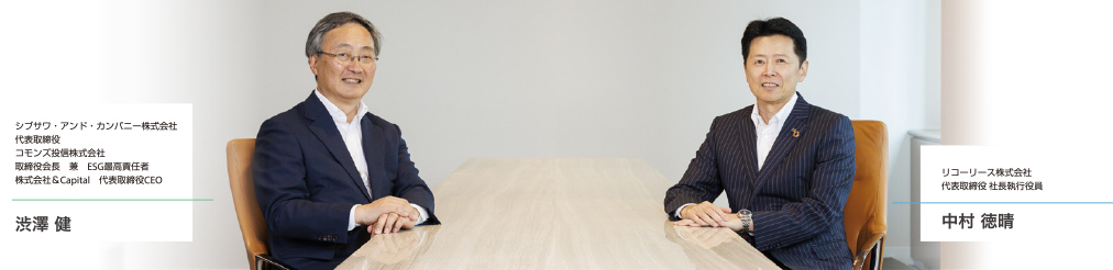近代⽇本経済の⽗といわれる渋沢栄⼀⽒が書いた『論語と算盤』には、現代の企業のサステナビリティ経営に通じる価値観が盛り込まれています。ここでは、栄⼀⽒の⽞孫(5代⽬の孫)にあたる、コモンズ投信株式会社 取締役会⻑ 兼 ESG最⾼責任者の渋澤健⽒をお招きし、「リコーリースの中⻑期視点での価値創造とサステナビリティ経営」をテーマに、当社社⻑の中村と対談を⾏いました。