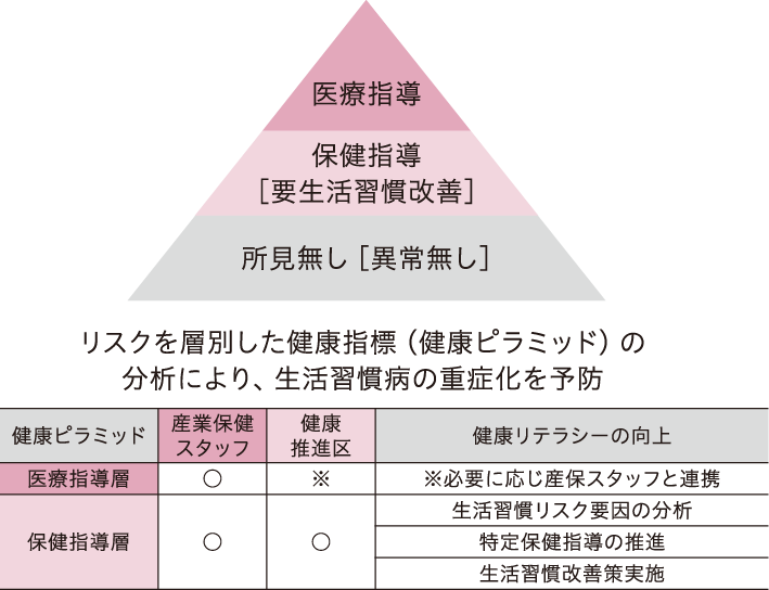 外部機関から当社が開示している健康指標(KPI・KGI)の数値や状態をもとに定期的にアドバイス頂いた内容。 - 社内の産業保健スタッフによる分析